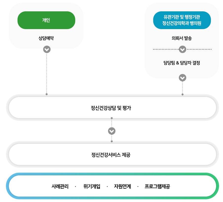 • 사회복지 유관기관 및 행정기관, 정신건강의학과 병의원 등의 기관에서 정신건강 문제로 인한 정신건강서비스 의뢰가 필요하다고 판단된 경우,